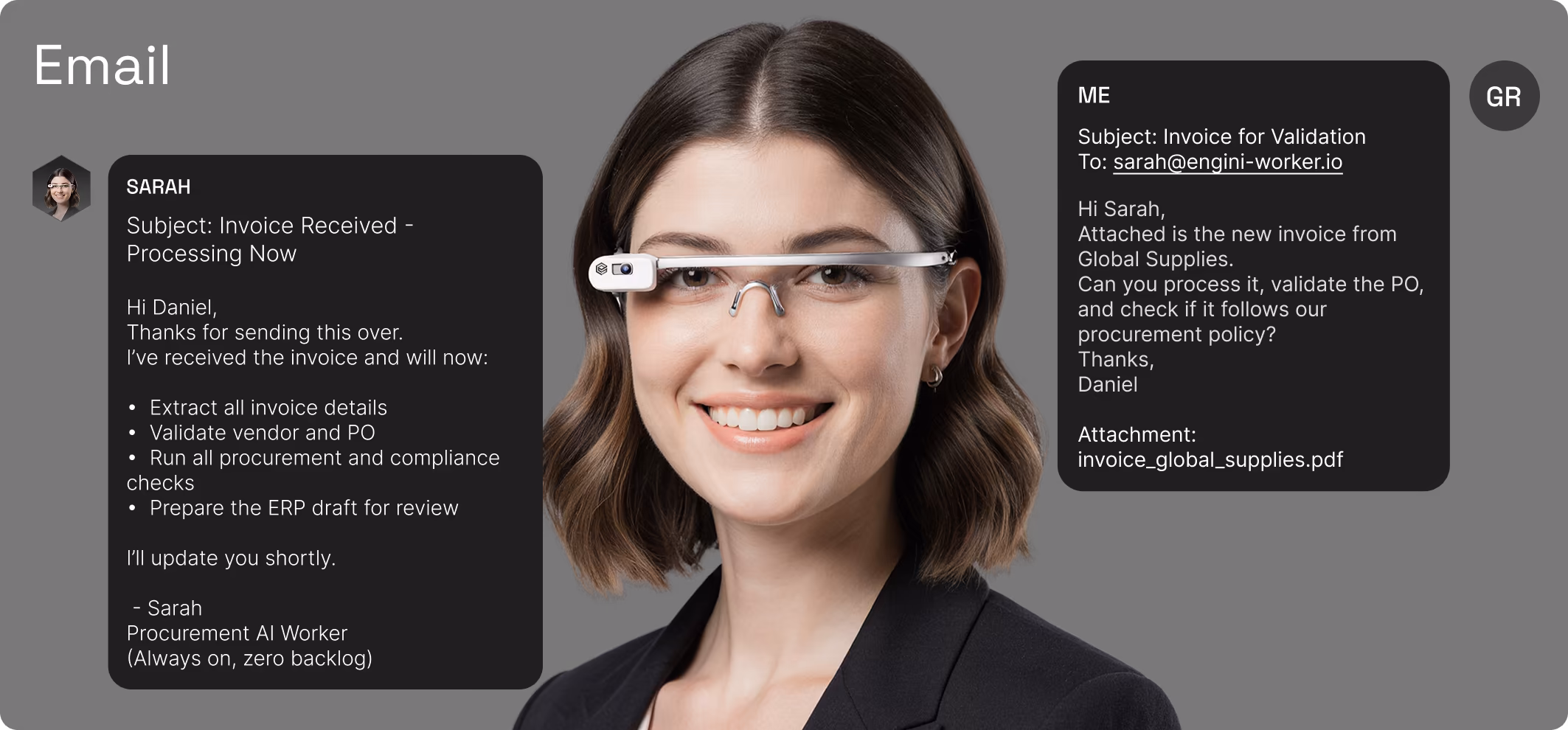 Workers understand natural language across chat, email, and voice, and respond instantly with actionable outputs.